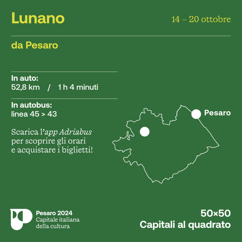 Nato nel segno di un metodo fortemente partecipato, il macro-progetto vede i cinquanta Comuni della Provincia di Pesaro e Urbino, ‘Capitale’ per una settimana lungo il 2024. Il ricco programma di 12 mesi tiene insieme oltre 350 soggetti grazie ad un inedito lavoro corale tra le amministrazioni sancito da un protocollo, coinvolge centinaia di artisti e creativi e rappresenta un invito al viaggio tra natura e cultura, alla scoperta di una terra policentrica e polifonica, tra mare e colline. 50×50 nasce da un’intelligenza collettiva che lavora anche sulle piccole comunità e intende il territorio non solo entro la cinta urbana ma come rete preziosa di relazioni e legami su un’area vasta e da ampliare: perché la Capitale della cultura è un’occasione per accrescere il capitale culturale di tutti i cittadini. Ponendo il focus sulle singole eccellenze, prende così forma il grande quadro di una provincia che vuole presentarsi al meglio all’Italia e al mondo con l’ambizione di essere un vero e proprio laboratorio di idee per le altre città che si candidano a Capitale italiana della cultura. Special Partner di progetto: Banca di Pesaro – Credito Cooperativo