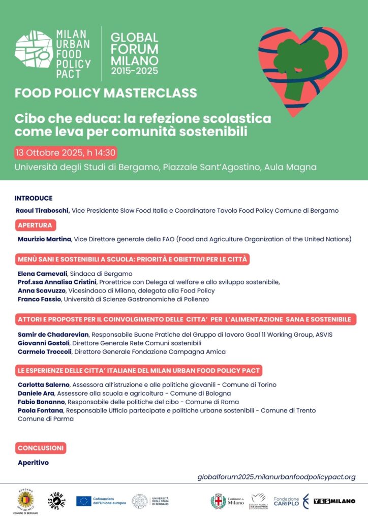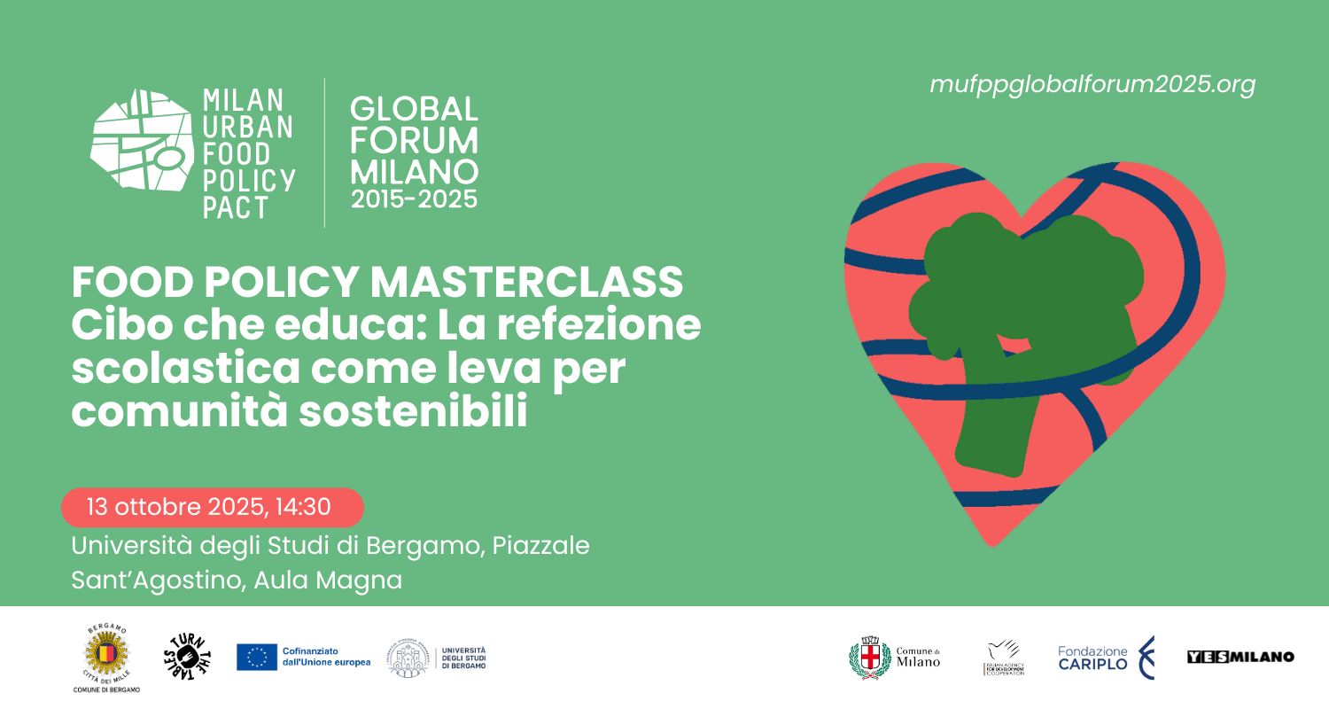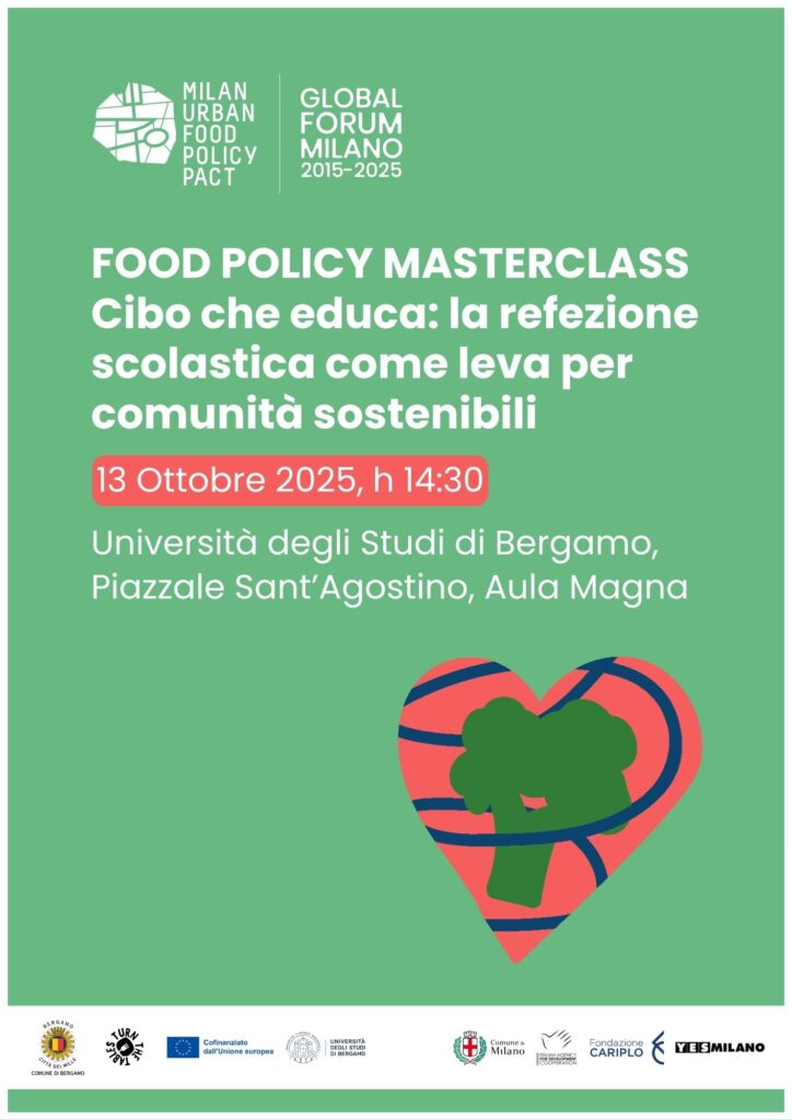 Nell’ambito del progetto Turn The Tables, Toward just, green and innovative food procurement!, il Comune di Bergamo organizzerà un side event del Global Forum, una Food Policy Masterclass nell’Aula Magna dell’Università di Bergamo il 13 ottobre alle ore 14.30, dal titolo Cibo che educa: la refezione scolastica come leva per comunità sostenibili.