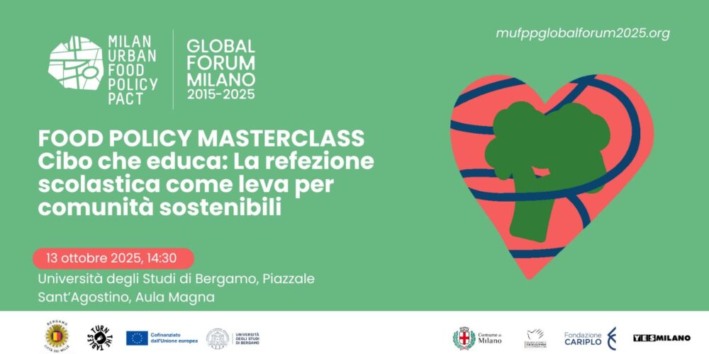 Nell’ambito del progetto Turn The Tables, Toward just, green and innovative food procurement!, il Comune di Bergamo organizzerà un side event del Global Forum, una Food Policy Masterclass nell’Aula Magna dell’Università di Bergamo il 13 ottobre alle ore 14.30, dal titolo Cibo che educa: la refezione scolastica come leva per comunità sostenibili.
