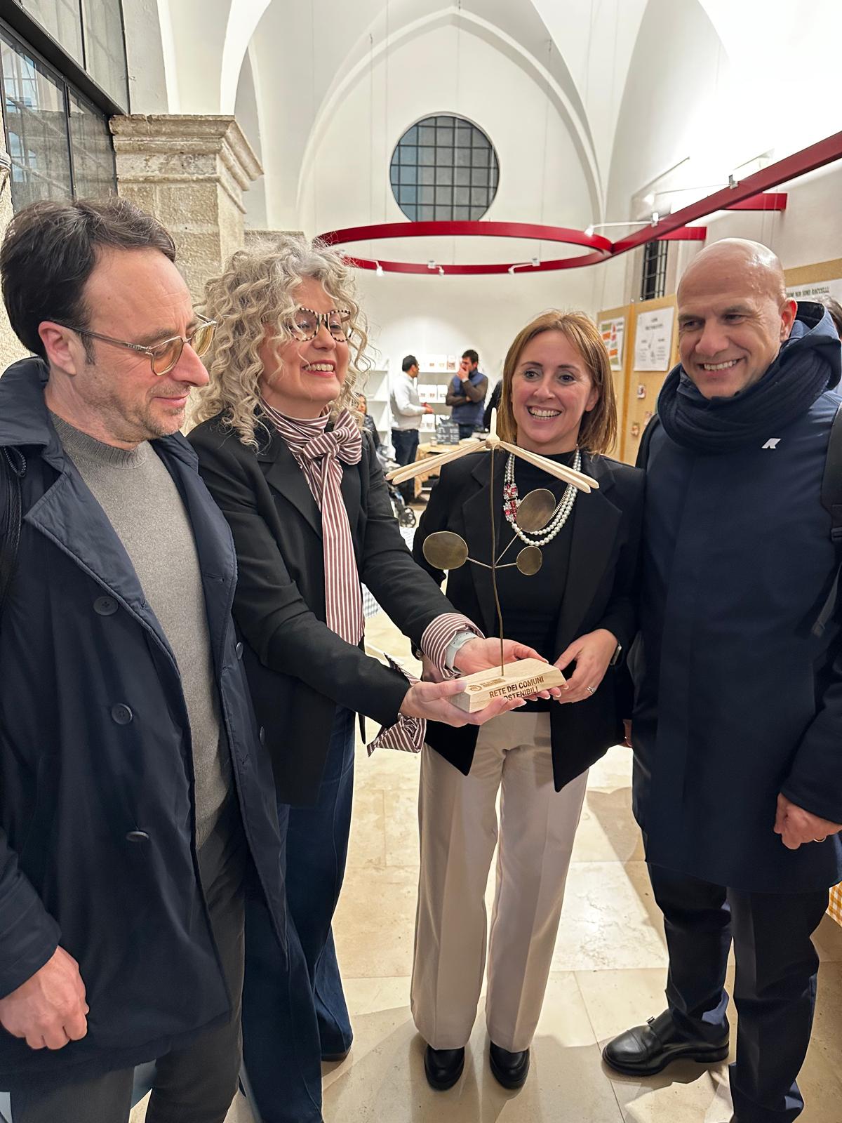 La cerimonia di consegna si è svolta ieri 19 febbraio al Food Policy Hub, nell’ambito delle iniziative promosse dall’amministrazione comunale – assessorati alla bellezza e alla qualità della vita per M’Illumino di meno 2026, la storica campagna nazionale che diffonde la cultura del risparmio energetico e degli stili di vita sostenibili, e Spaccio Terre – Sapori, Saperi Socialità, il mercatino a filiera cortissima che connette piccoli agricoltori locali e consumatori Spaccio Terre, in collaborazione con Slow Food Andria – condotta Castel del Monte. Alla manifestazione era presente la sindaca Giovanna Bruno, l’assessora alla bellezza Daniela Di Bari, il presidente e il vicepresidente della Rete dei Comuni Sostenibili, rispettivamente Valerio Lucciarini De Vincenzi e Alessandro Broccatelli (che è anche presidente Leganet).